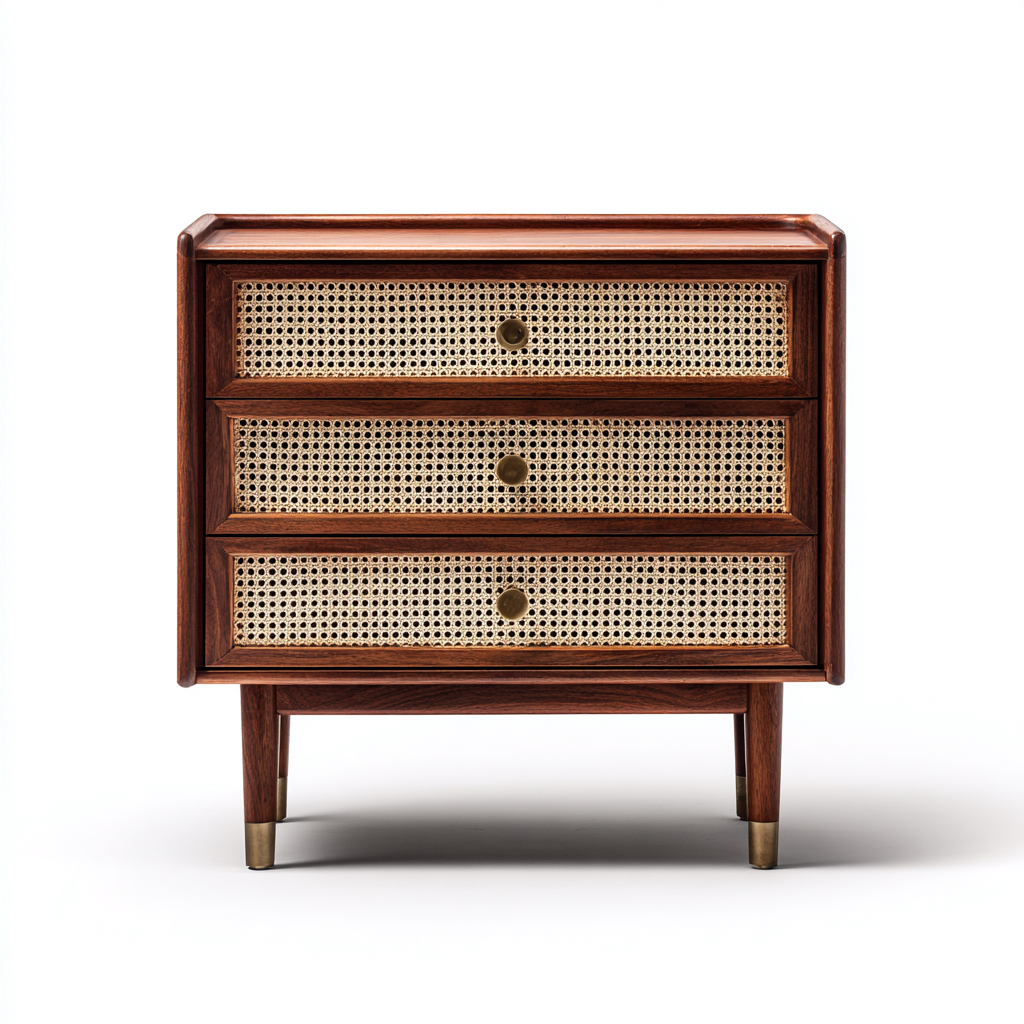Comò in legno di noce con cassetti in rattan 70x40x75 cm - noce-beige - stile vintage per soggiorno o camera da letto