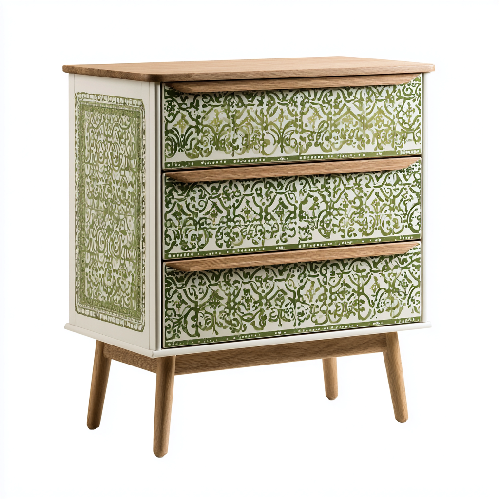 Cassettiera bianca e legno con tre cassetti e decorazione verde oliva 70x35x80 cm - bianco-verde oliva - stile scandinavo per soggiorno o camera da letto
