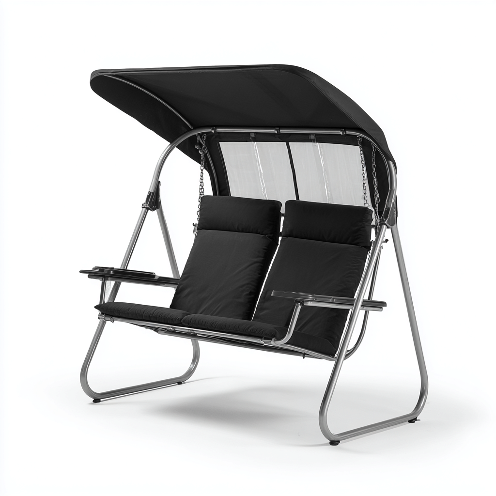 La struttura è realizzata in metallo con finitura color argento studiata per l'uso in ambienti esterni. La seduta e gli schienali sono rivestiti in tessuto resistente di colore nero con imbottitura progettata per garantire supporto e stabilità nel tempo. La copertura superiore offre protezione dalla luce diretta.