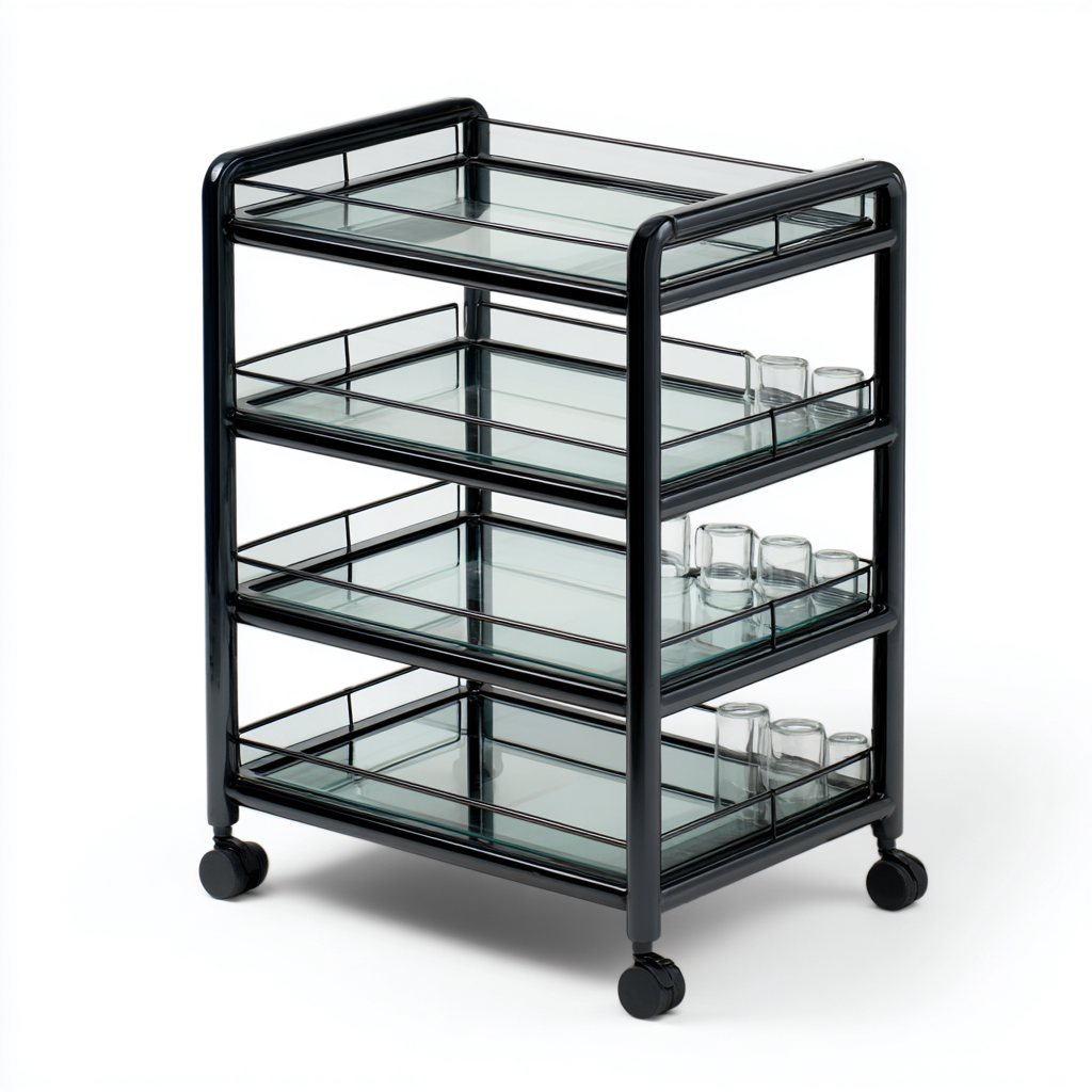 La struttura è realizzata in metallo verniciato nero con finitura liscia, abbinata a ripiani in vetro trasparente che conferiscono leggerezza visiva e facilità di pulizia.