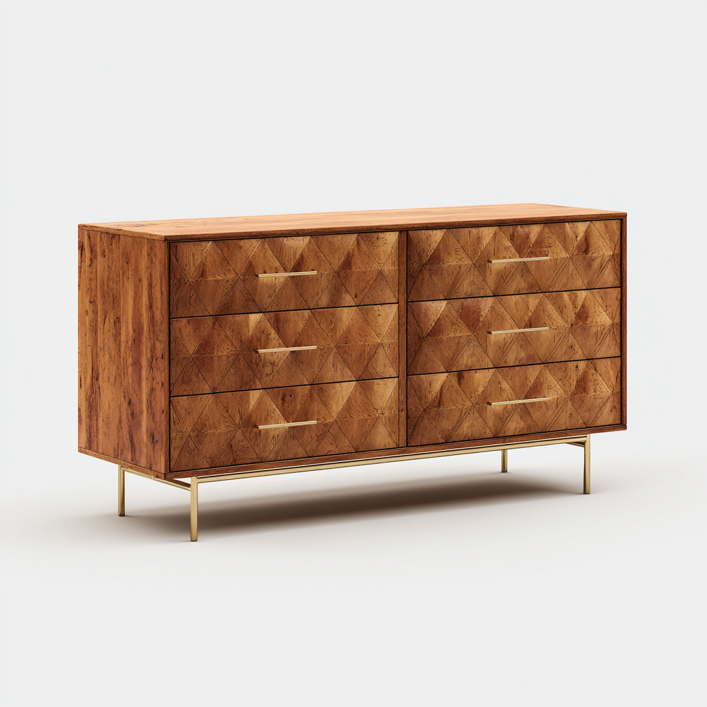 Questa cassettiera dal design elegante è caratterizzata da un mix di legno naturale e dettagli in metallo dorato, che la rendono perfetta per aggiungere un tocco di stile al soggiorno o alla camera da letto. I numerosi cassetti offrono un ampio spazio di archiviazione per organizzare oggetti e accessori.