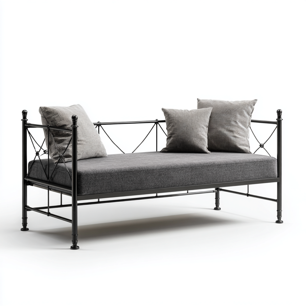 La struttura è realizzata in metallo verniciato di colore nero, progettata per garantire stabilità e resistenza nel tempo. La superficie di seduta è completata da un materasso rivestito in tessuto di colore grigio, adatto all'uso quotidiano come divano e come letto.