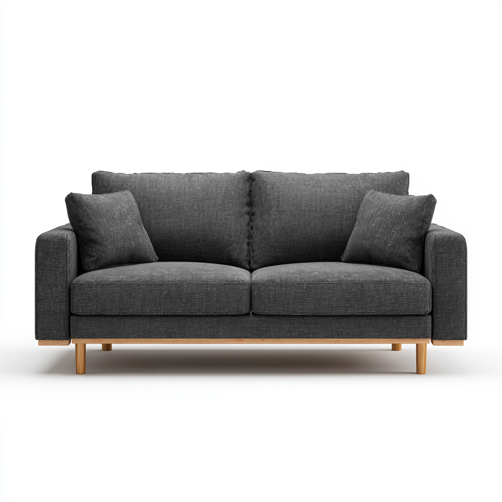 Questo divano lineare a due posti, rivestito in tessuto grigio scuro, è perfetto per aggiungere eleganza e comfort al soggiorno. I cuscini imbottiti e le linee pulite garantiscono una seduta comoda e uno stile senza tempo.
