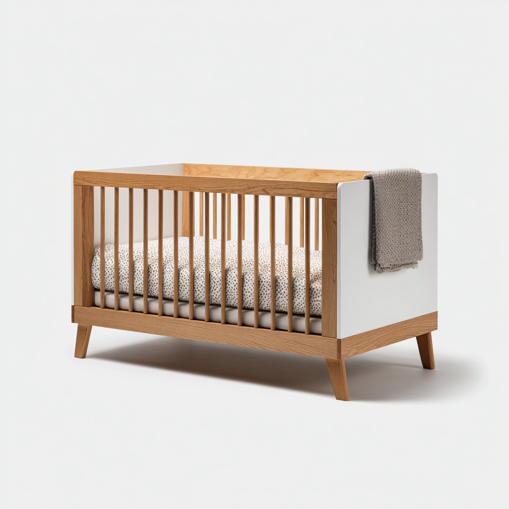 Questo lettino per bambini dal design moderno è pensato per offrire uno spazio di riposo sicuro e accogliente nella cameretta. La combinazione di superfici in legno naturale e pannelli chiari crea un'estetica equilibrata e adatta a diversi stili di arredamento.