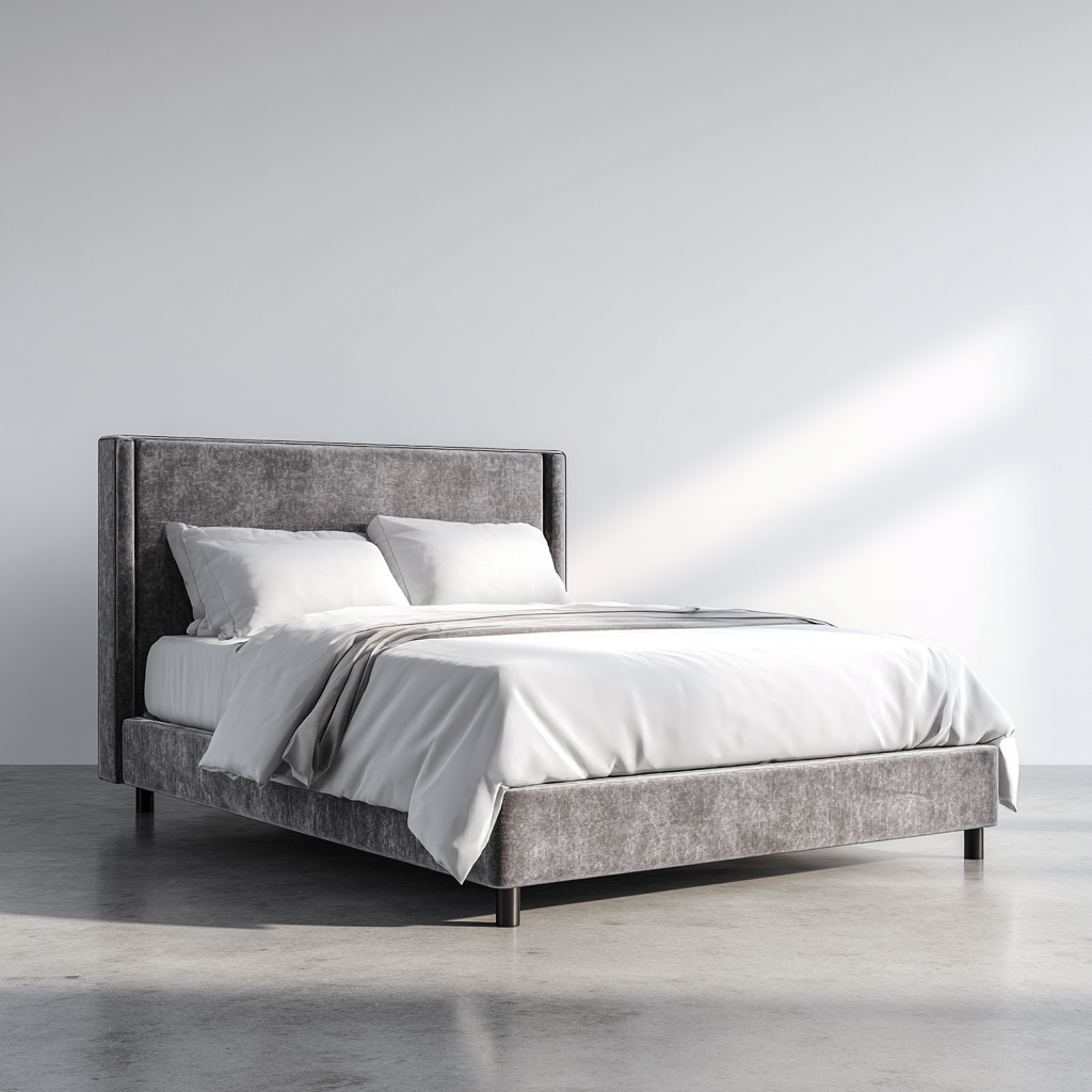 Questo letto matrimoniale imbottito dal design moderno si distingue per le linee pulite e l'aspetto elegante, ideale per una camera da letto contemporanea e raffinata.