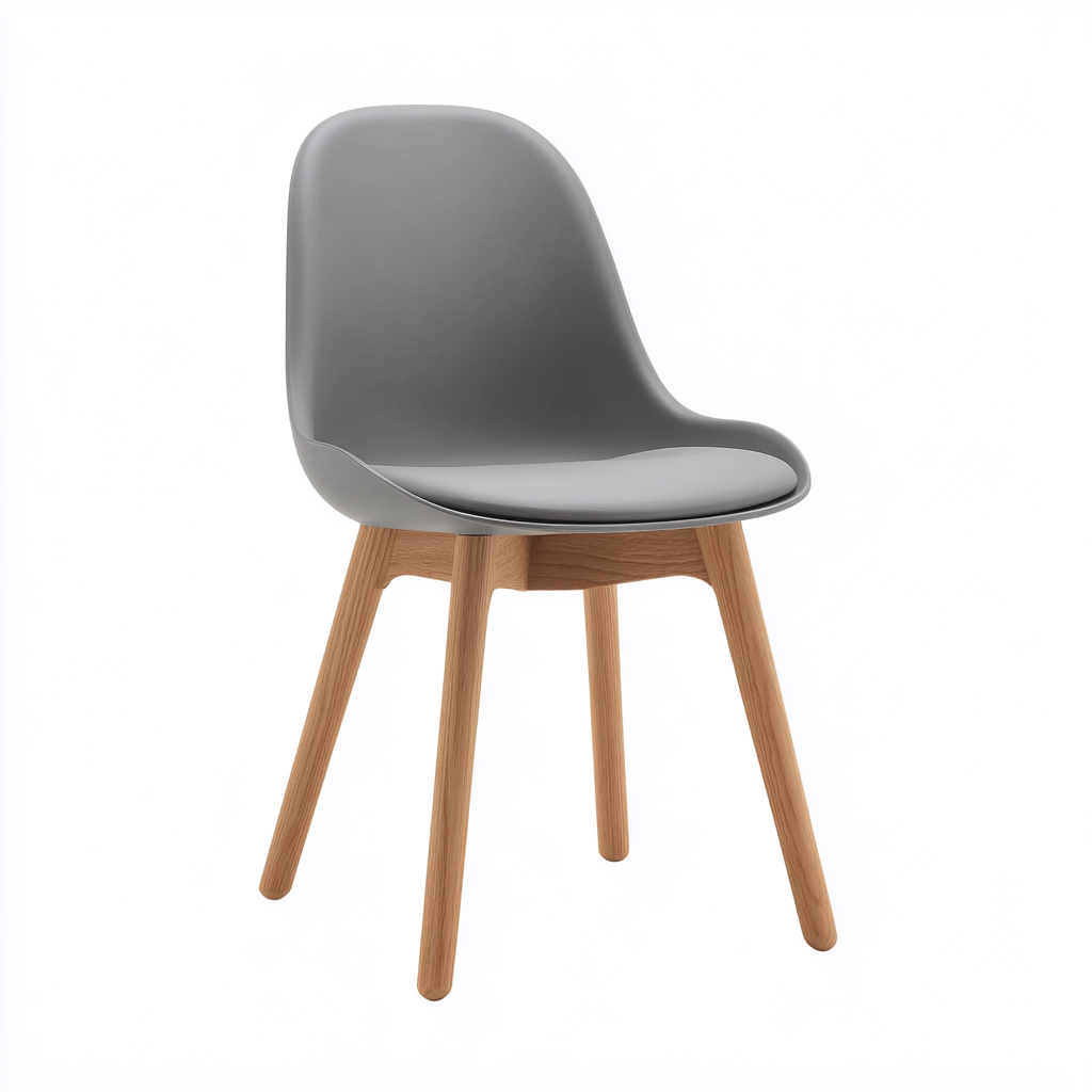 La seduta è realizzata in plastica di colore grigio con superficie liscia e facile da pulire. Le gambe in legno garantiscono stabilità e un aspetto naturale, adatto a diversi contesti abitativi.