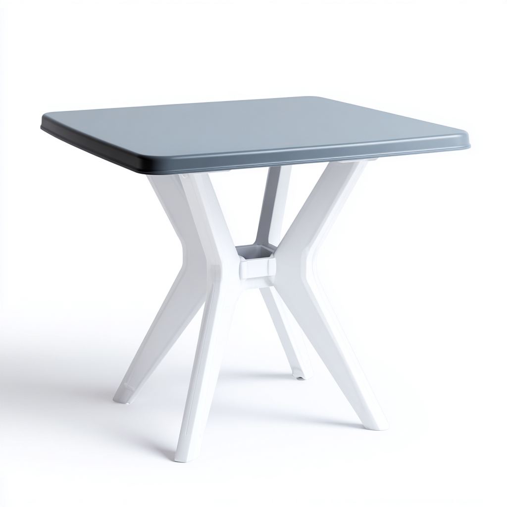 Il piano è realizzato in plastica resistente di colore grigio con superficie liscia e facile da pulire. La struttura di supporto è realizzata in resina di colore bianco progettata per garantire stabilità e una buona resistenza all'uso in ambienti esterni.