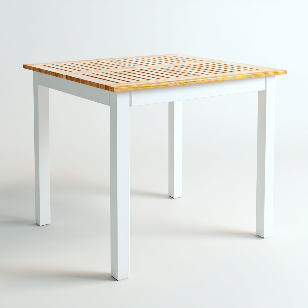 Il piano è realizzato in legno con finitura naturale a listelli, adatto all'utilizzo in ambienti esterni. La struttura portante è in metallo verniciato di colore bianco, progettata per garantire stabilità e resistenza nel tempo.