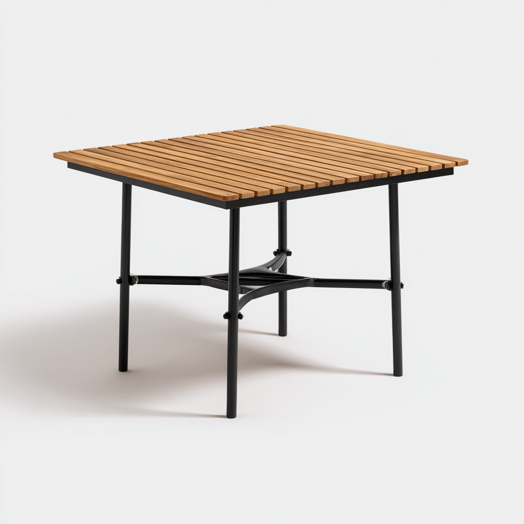 Il piano è realizzato in legno con finitura naturale disposto a listelli, adatto all'utilizzo in ambienti esterni. La struttura portante è in metallo verniciato di colore nero, progettata per garantire stabilità e resistenza nel tempo.