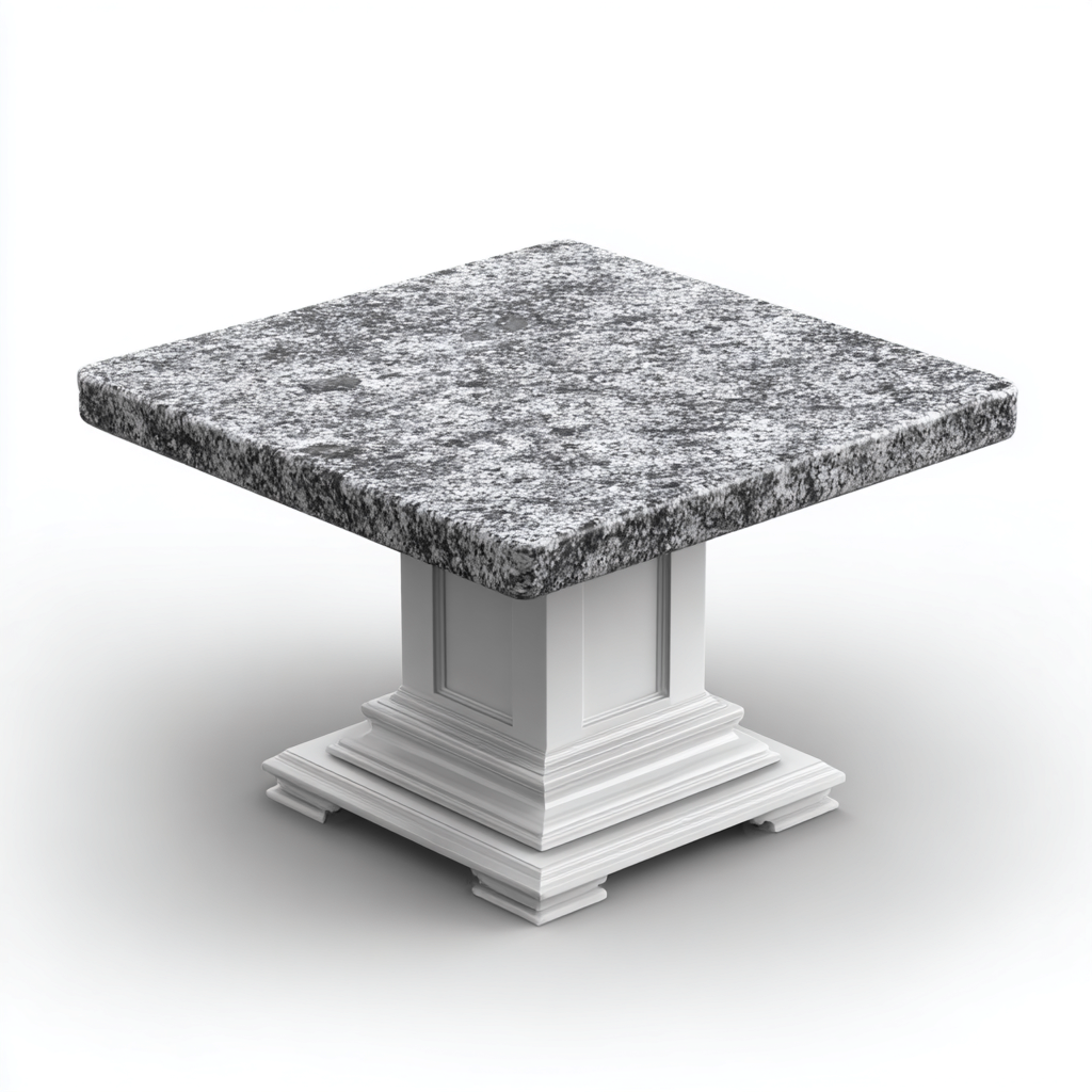 Il piano è realizzato in pietra con finitura grigio granito dall'aspetto naturale e resistente. La base è realizzata in materiale composito con finitura bianca progettata per garantire stabilità e una buona resistenza all'uso in ambienti esterni.