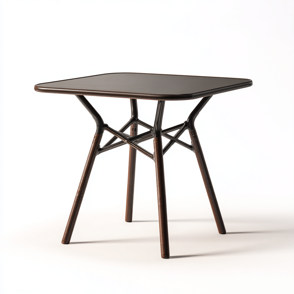 Il tavolo è realizzato interamente in plastica resistente di colore marrone con finitura uniforme. La struttura è progettata per l'utilizzo in ambienti esterni garantendo stabilità e una buona resistenza all'uso quotidiano.