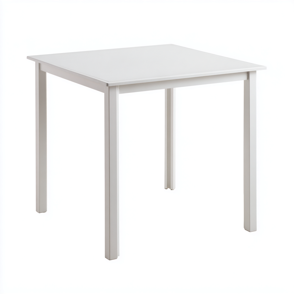 La struttura è realizzata in plastica resistente adatta all'utilizzo in ambienti esterni garantendo stabilità e facilità di manutenzione. Il piano e le gambe sono di colore bianco con una superficie progettata per resistere all'uso quotidiano all'aperto.