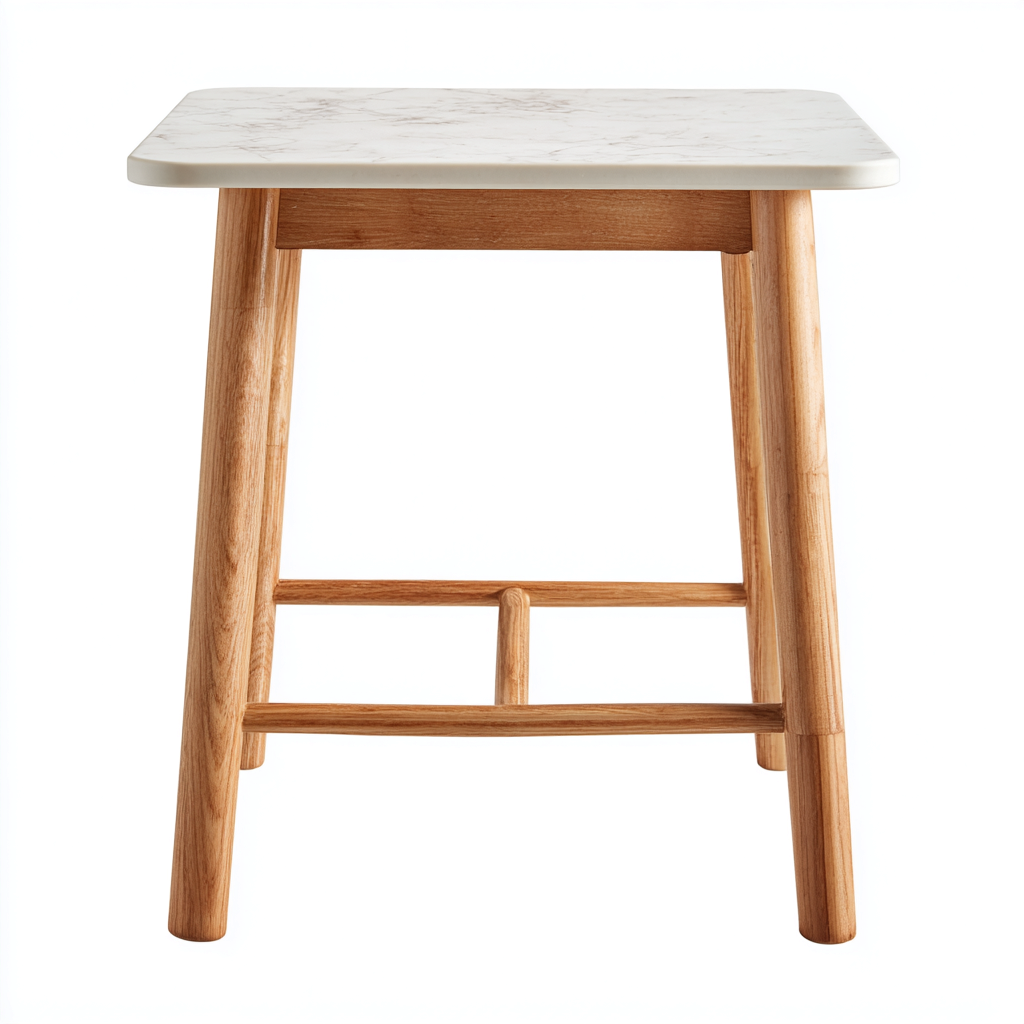 Il piano è realizzato con superficie effetto marmo di colore bianco, liscia e facile da pulire. La struttura e le gambe sono in legno naturale, accuratamente lavorate per garantire stabilità e una finitura uniforme.